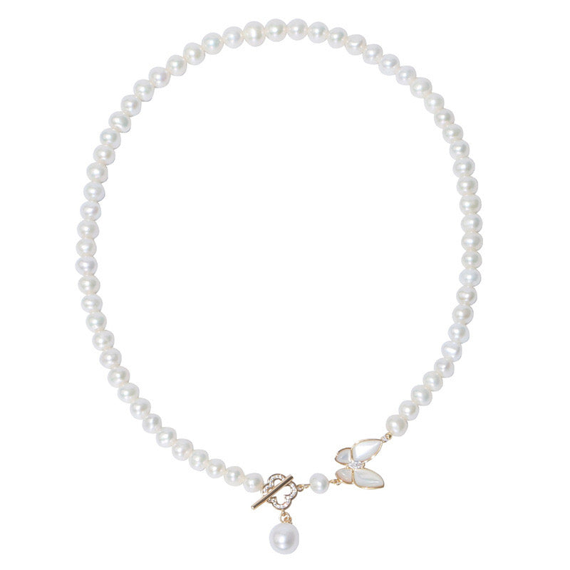 Adorn your neckline with the delicate charm of our Butterfly Pendant Freshwater Pearl Strand Necklace. This enchanting piece features near-round 6-7mm freshwater pearls, each with slight imperfections that add character and uniqueness. The necklace spans 43cm in length and is highlighted by a clover-shaped toggle clasp, which complements the butterfly pendant beautifully. The metal components are crafted from gold-plated copper, adding a touch of luxury and durability to this elegant accessory."